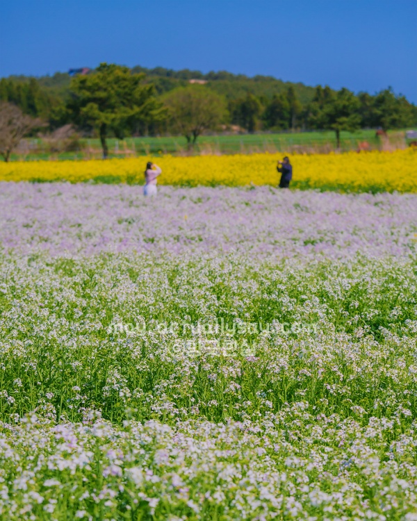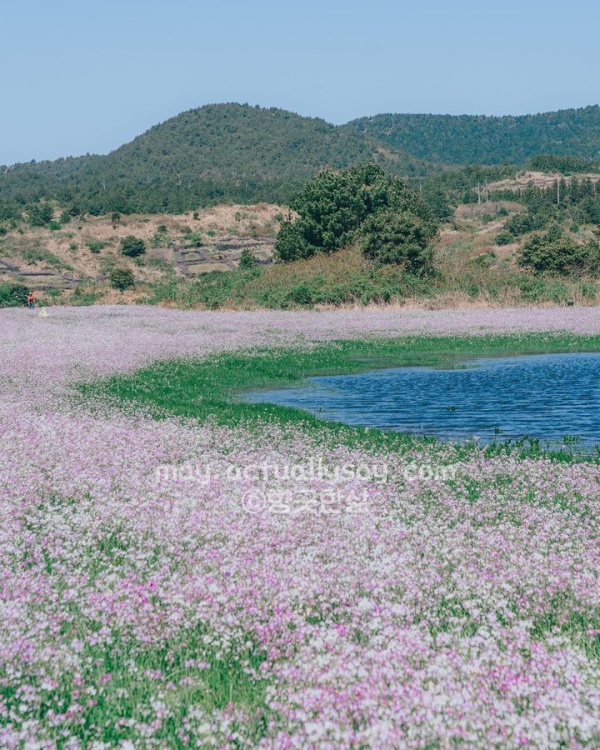 서귀포시 표선면 성읍리 24번지에 도착하면 연보랏빛 안개가 지면에 낮게 깔린 듯한 몽환적인 풍경을 마주하게 돼. 갯무꽃은 우리가 흔히 아는 유채꽃보다 색감이 훨씬 연하고 청초해서 보고 있으면 마음이 참 차분해지는 기분을 느낄 수 있어. 인위적으로 가꿔진 정원이라기보다 제주의 바람과 흙이 만들어낸 야생화 군락지라 그런지, 꽃대 하나하나가 아주 꼿꼿하고 생명력이 넘치는 게 매력이야.