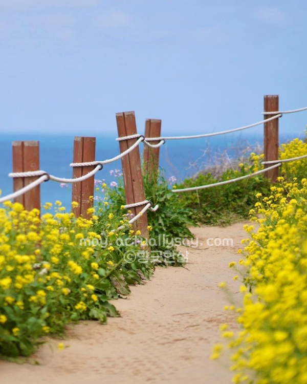 가파르지 않은 산책로를 따라 조금만 올라가면 탁 트인 바다 전망이 시원하게 펼쳐지는데, 4월의 바닷바람이 코끝을 간지럽히며 기분을 상쾌하게 만들어줘. 일몰 때 맞춰 올라가면 노을빛에 물든 꽃밭과 바다가 하나로 어우러지는 환상적인 광경을 볼 수 있으니 시간 맞춰 가보길 바라. 옥빛 바다와 노란 꽃의 대비가 만드는 비현실적인 풍경 속에서 제주의 봄 바다가 주는 위로를 온몸으로 만끽할 수 있어.