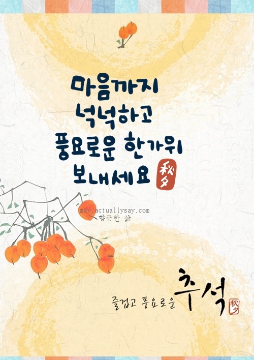 한 해의 풍요로움을 만끽할 수 있는 추석 명절이 찾아왔습니다. 사랑하는 사람들과 함께 웃음과 행복이 넘치는 명절 되시길 바랍니다. 풍성한 가을처럼 여러분의 삶에도 기쁨이 가득하길 기원합니다. 해피 추석!